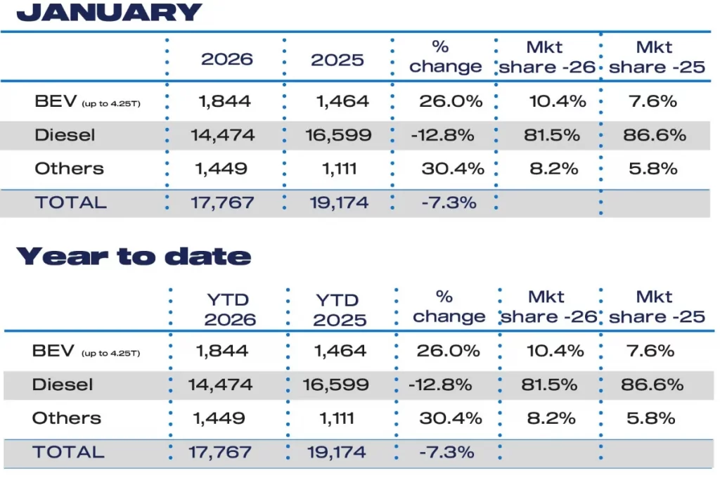 Electric van uptake continued to rise, with registrations up 26.0% to 1,844 units. However, battery-electric models accounted for just 10.4% of the total market, well short of the 24% share required under the 2026 zero-emission mandate.