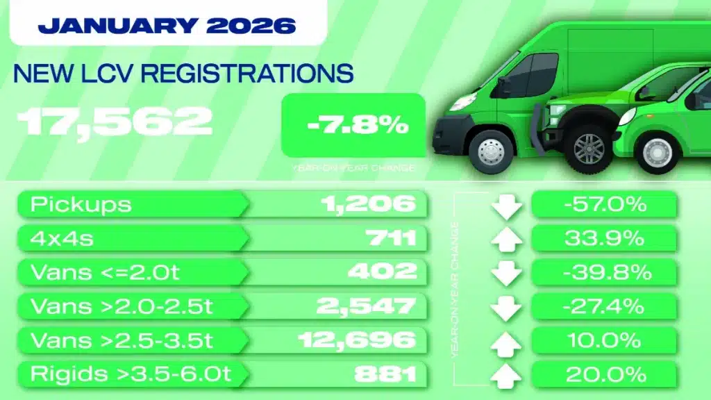 New light commercial vehicle (LCV) registrations fell 7.8% year on year in January, with 17,562 vans, pickups and 4x4 LCVs joining UK roads, according to the latest data published by the Society of Motor Manufacturers and Traders.